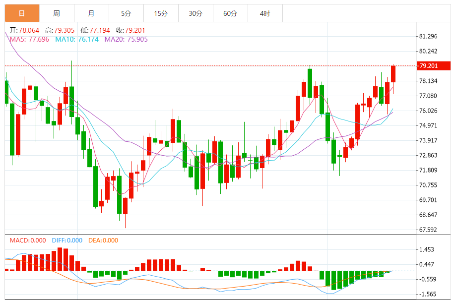 4小时图台阶向上当中,以75.80做为次低点整理蓄势台阶向上,但节奏上又不是强单边,伴随反复的探高回踩确认,操作上主思路维持逢低做多。节奏是向上的,但也要把握点位的切入,综合来看,原油短期操作思路上议上方短期关注79.0-80.0一线阻力,下方短期关注76.0-75.0一线支撑。