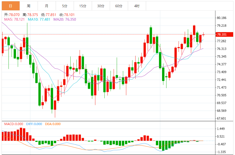 WTI原油4小时图可以看到,过去几天WTI原油价格在75美元以上强势上涨,逐步攀升至76.50美元上方的积极区域,在站上多条均线之后,价格最终攀升到78美元以上。