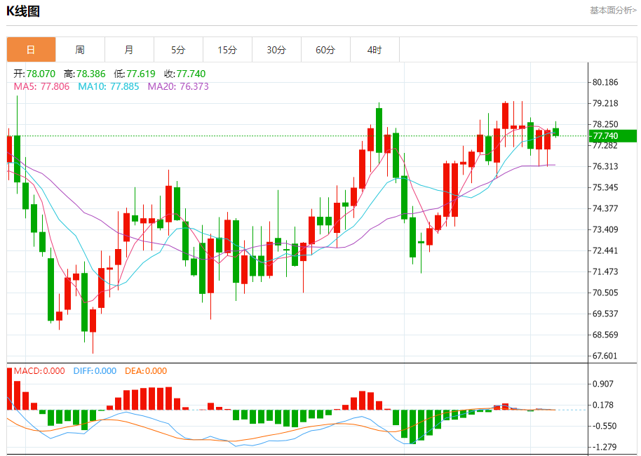 周四盘中,WTI原油报77.735,跌幅0.38%。