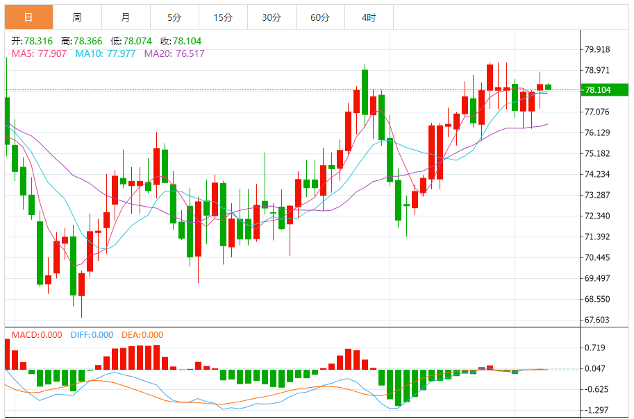 今天的预期交易范围:在76.60支撑位和79.50阻力位之间