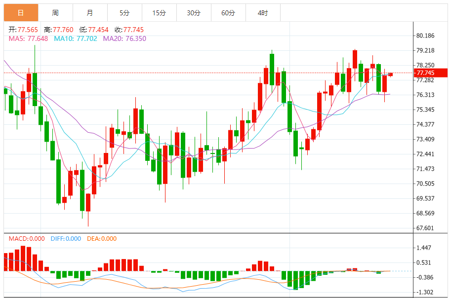 今天的预期交易范围:在76.50支撑位和79.50阻力位之间