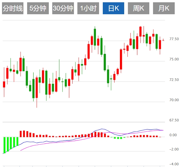 今日预期的交易范围在76.50支撑和79.50阻力之间。