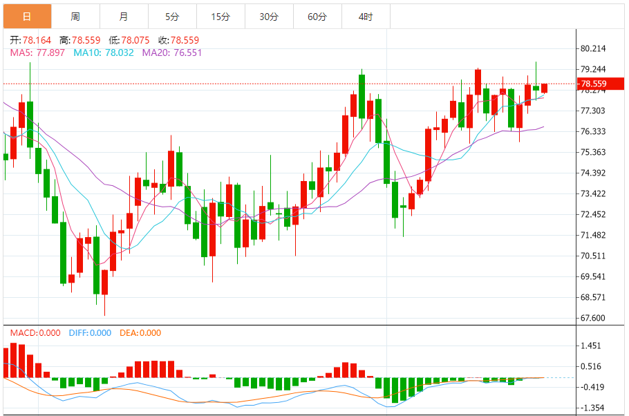今天的预期交易范围:在77.30支撑位和80.20阻力位之间
