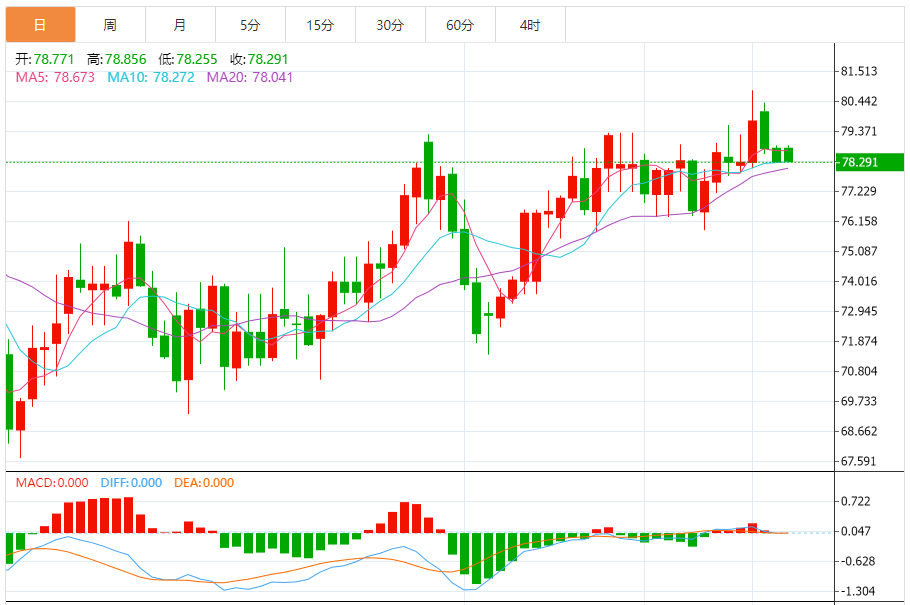 今天的预期交易范围:在77.00支撑位和80.00阻力位之间