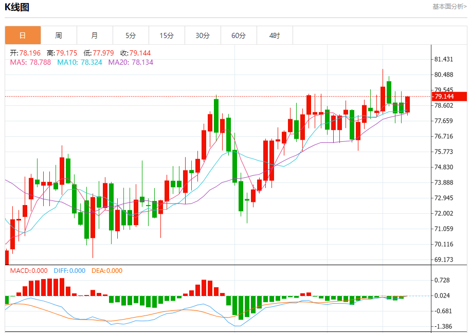 周三盘中,WTI原油报79.139,涨幅1.29%。