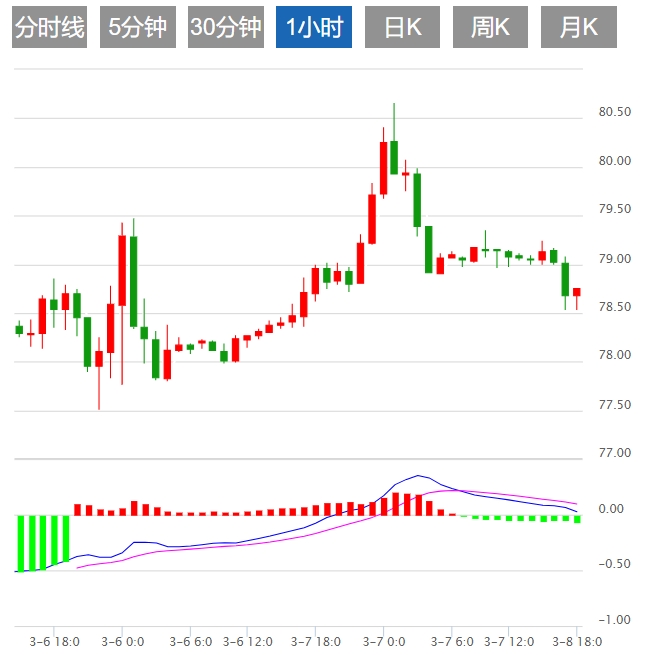 技术上,4小时图可以看出,价格稳定在78.00美元水平,200简单移动平均线和100简单移动平均线之上。价格在78.80美元阻力位开启一轮涨势。当前价格在从80.96美元的高点到77.60美元50%斐波那契回撤位附近短暂整理。目前的价格走势表明价格有很大机会再次上涨到80美元上方。