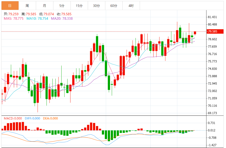 今天的预期交易范围:在78.25支撑位和81.20阻力位之间