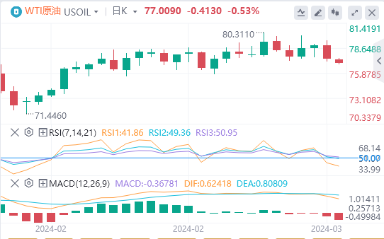 WTI油价连续第三个交易日持续下跌,原因是经济数据显示中国原油进口减少。今年前两个月原油进口减少了约5.7%,降至1080万桶/日,而12月份原油进口量为1144万桶/日。截至目前,WTI原油报价77美元,Brent原油报价81.23美元。