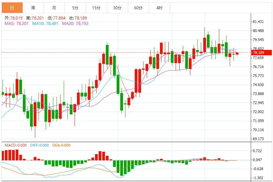 今天的预期交易范围:在76.30支撑位和80.00阻力位之间