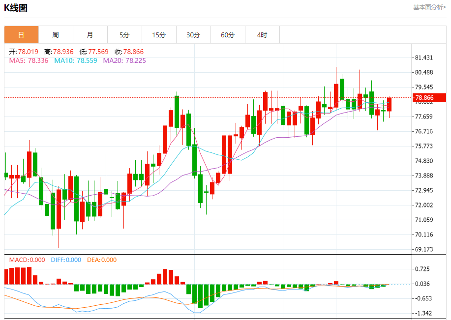 周三盘中,WTI原油报78.950,涨幅1.19%。