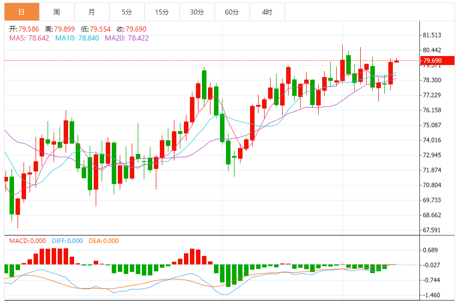 今天的预期交易范围:在78.50支撑位和81.50阻力位之间