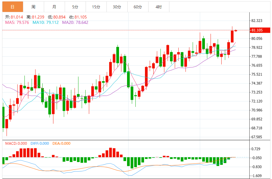 今天的预期交易范围:在79.60支撑位和82.70阻力位之间