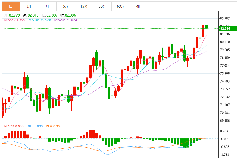 在上方,价格面临82.80美元水平附近的阻力。下一个主要阻力位于83.00美元区域,如果上破该水平,价格可能会加速上涨。如果涨势继续,价格可能测试85.00美元的阻力位。
