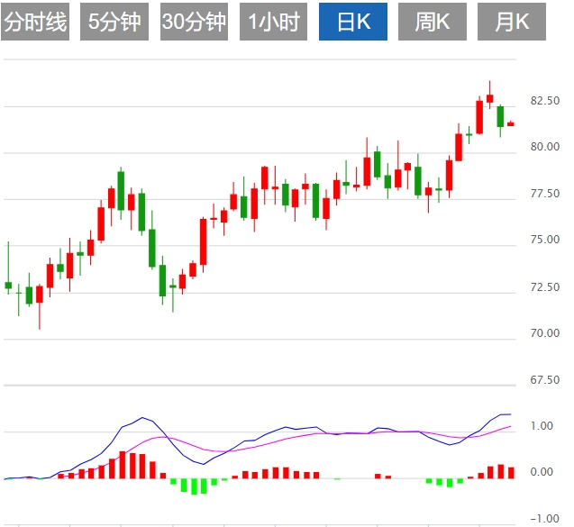 技术日线图上,原油上破了80美元水平,反弹在83美元附近的阻力上涨受阻,这里也是上升通道上限所在的位置。在这里,我们可以预期卖家会在下跌到通道下限时,带着高于头寸阻力的确定风险介入。另一方面,买家希望看到价格突破更高,以使看跌设置无效,并将看涨押注增加到93美元的水平。