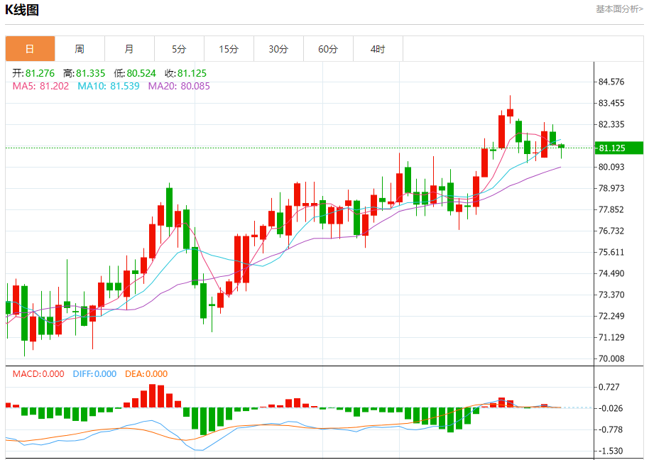 周三盘中,WTI原油报81.035,跌幅0.28%。