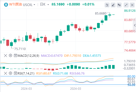 4月4日,周四亚市早盘,原油价格进入看涨盘整阶段,在前日触及的2023年10月以来最高水平附近维持窄幅震荡。WTI油价目前处在85.00美元关口紧上方,全天几乎波动不大,受到多方力量的共同影响。