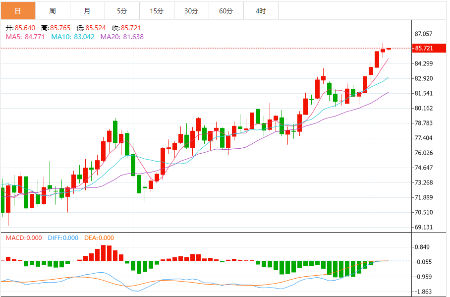 本周迄今,国际油价上涨近3%,刷新了10月底以来新高。布伦特原油期货价格涨超89美元/桶,而美国西德克萨斯中质原油期货价格则登上了85美元/桶大关,双双日线录得五连阳。