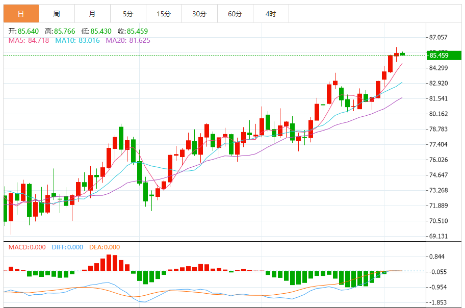 今天的预期交易范围:在84.50美元支撑位和87.60美元阻力位之间。