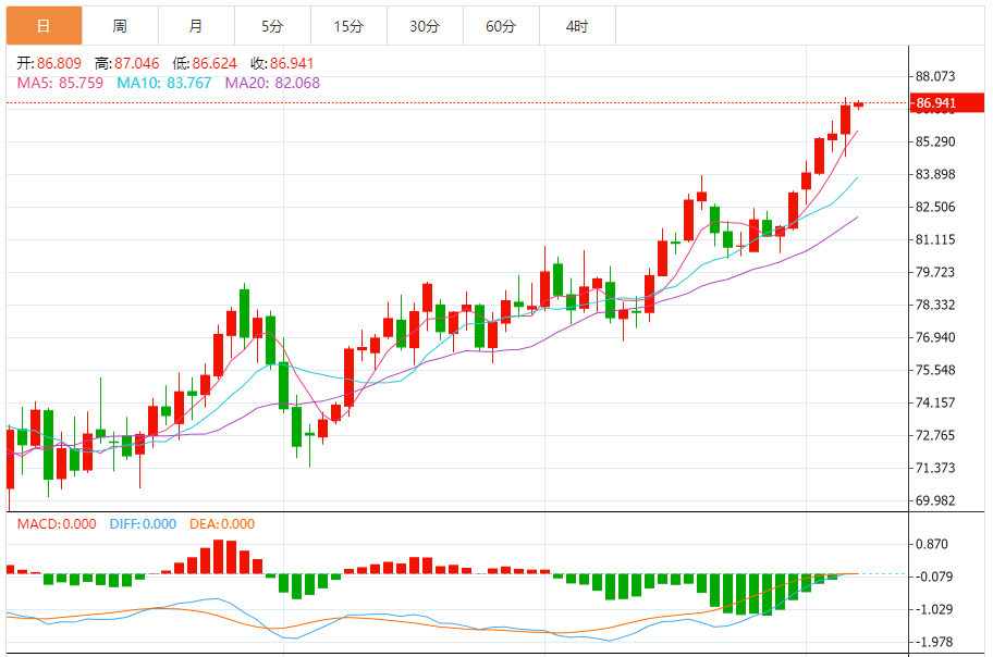 周五(4月5日),美原油价格交投于86.954美元/桶附近,涨幅为0.14%。原油价格昨日以明显的利好收盘,突破87.00美元关口。