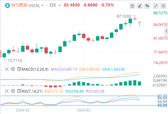 4月8日,周一欧市盘中,原油价格为85.49美元,下跌0.78%。