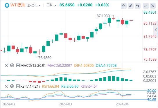 4月11日,周四欧市盘前,原油(WTI)美国原油价格难以利用前一天从84.00美元关口或一周低点的良好反弹势头,欧市盘前窄幅震荡。目前交投于85.75-85.80美元附近,对中东危机恶化的担忧仍为其提供了良好支撑。