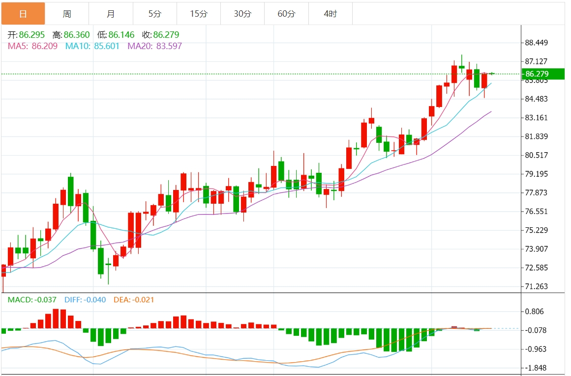 预期交易区间:支撑位在85.20,阻力位在88.25。