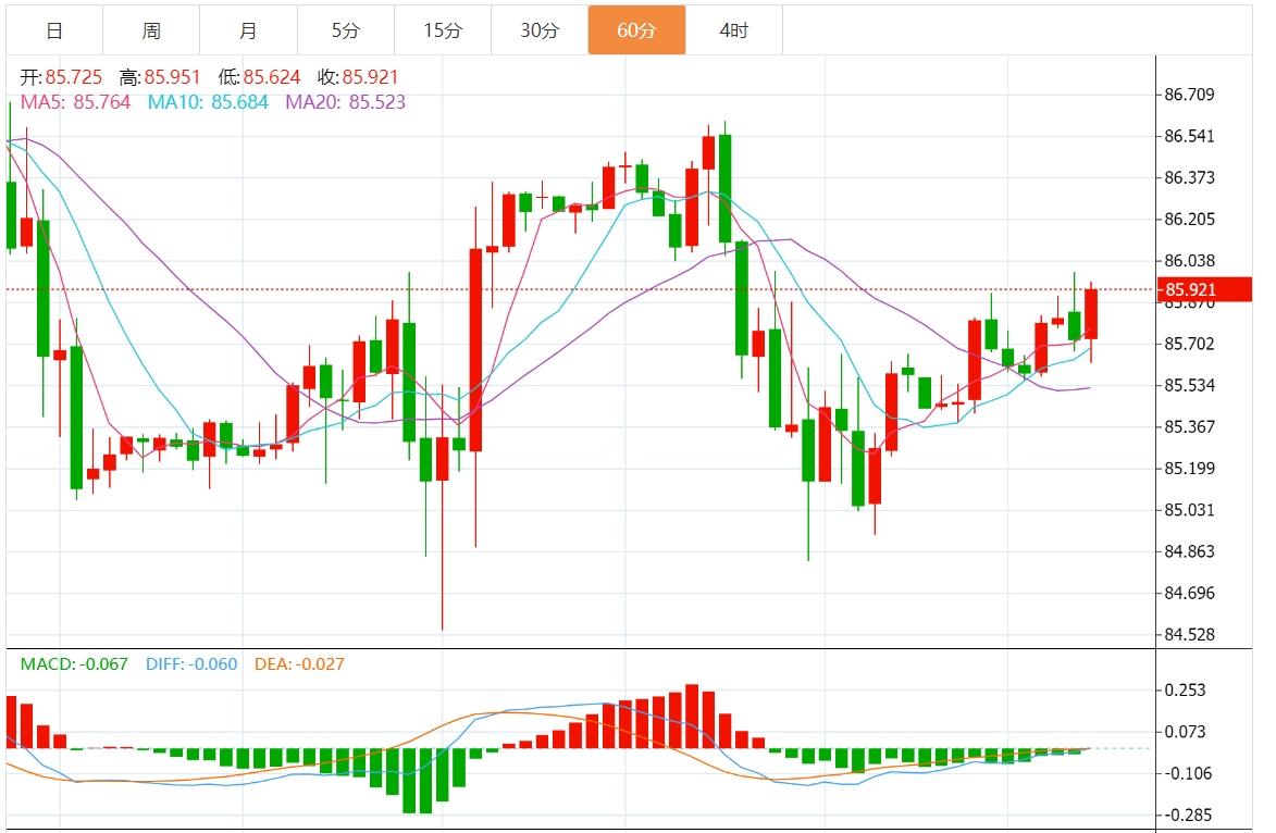 周五欧盘,WTI油价日内上涨0.40%,交投于85.96附近,有望测试86美元关口。技术上来看,WTI原油正试图在85美元区域上方再次上涨。