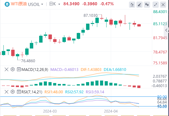 WTI油价交投于84.25美元附近。美联储主席鲍威尔发表鹰派言论抵消了中东地缘政治紧张局势升级的影响,WTI油价当天走低。截至目前,WTI原油报价84.34美元,Brent原油报价88.95美元。