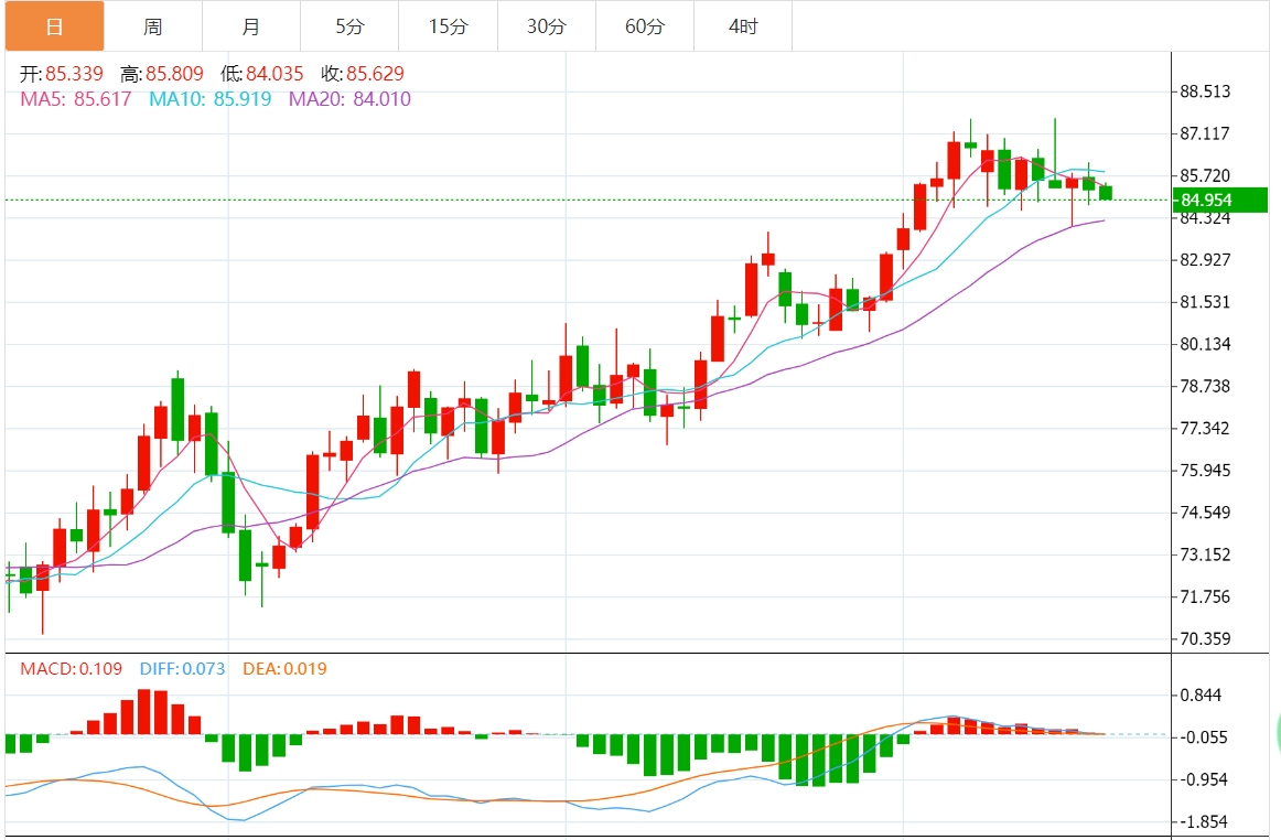 技术面来看,油价短线初步见顶,后市面临进一步下行风险,美原油关注55日均线80.88附近支撑、80整数关口支撑;上方留意21日均线84.05和10日均线85.21附近阻力。