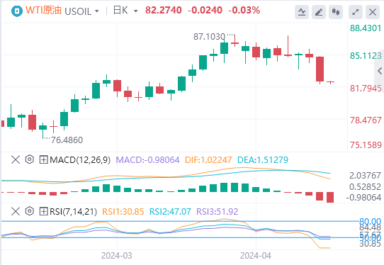 由于原油库存攀升,且市场越来越不相信伊朗和以色列会爆发更广泛的战争并影响石油供应,国际油价大跌。截至目前,WTI原油报价82.275美元,Brent原油报价86.98美元。