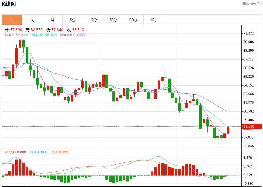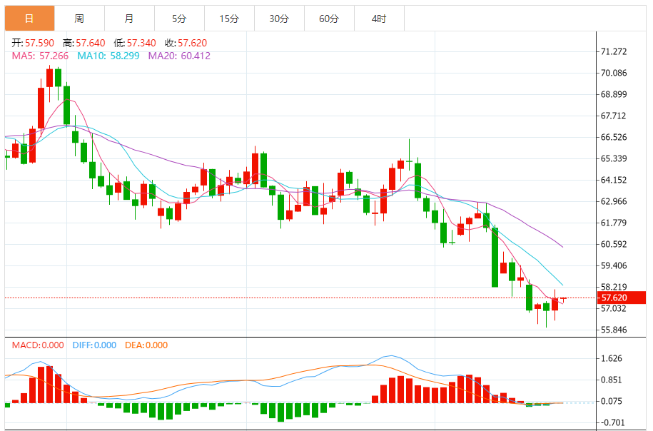 周一盘中,WTI原油报56.800,跌幅0.61%。