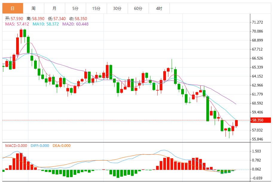今日分析:在 57.40 之下,看跌,目标价位为 56.15 ,然后为 55.55 。
