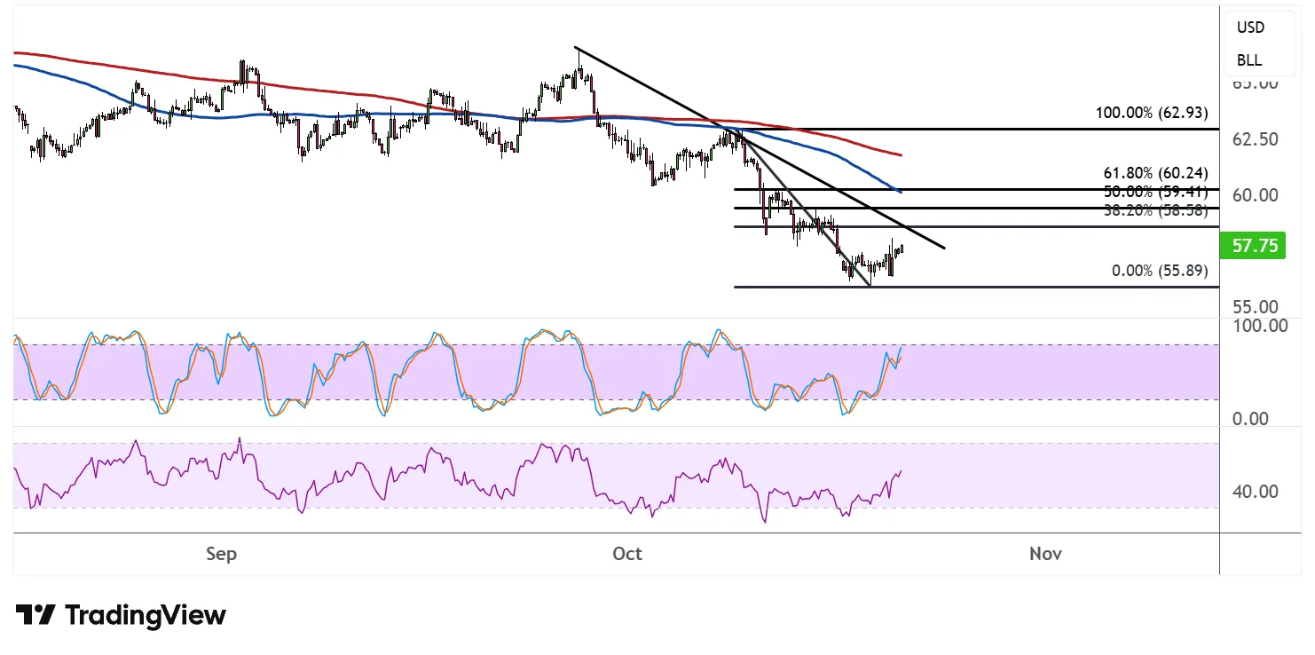 WTI原油已跌破长期支撑区域,目前正在回调以测试阻力位,价格交投于每桶57.75美元附近。该商品最近突破了下降趋势线,在下一次潜在走低之前可能会发生修正。