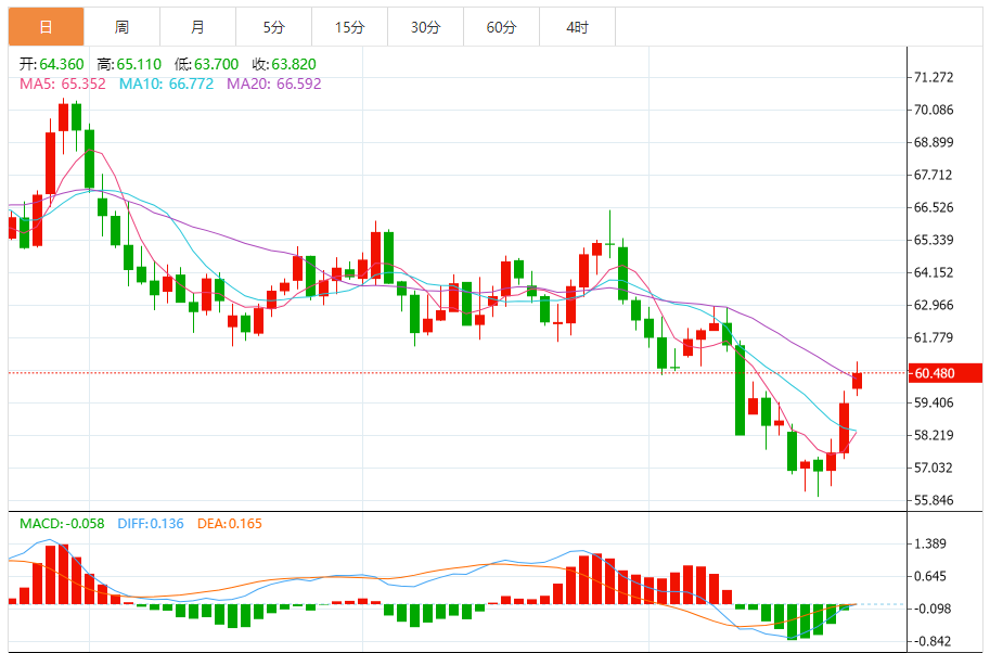 周四(10月23日),美原油价格交投于59.800美元/桶附近,涨幅为2.22%。
