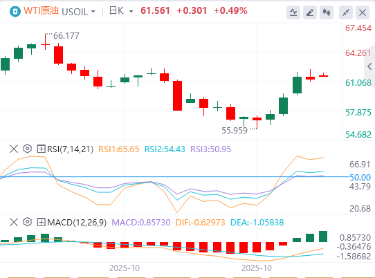 10月27日,原油(WTI)周一亚洲交易时段交投于61.56美元附近。由于中美贸易谈判取得进展提振了石油需求前景,WTI小幅走高。美国石油协会(API)每周原油库存报告将于周二发布。