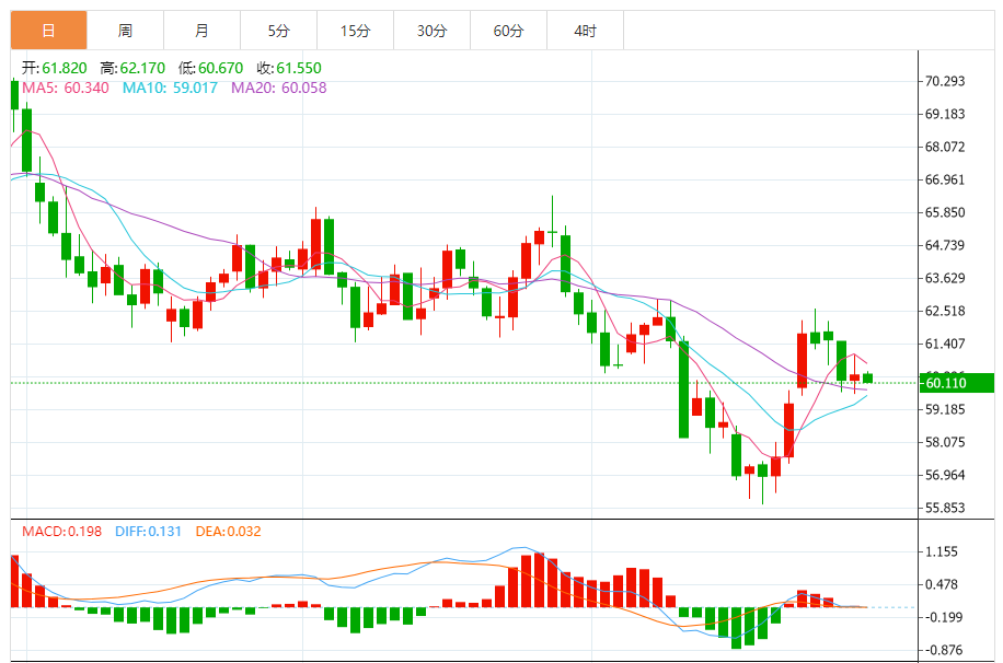 周三盘中,WTI原油报60.120,跌幅0.05%。