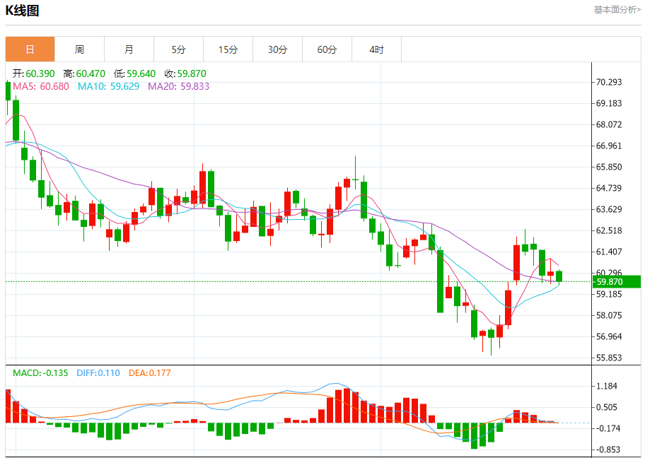 周四(10月30日),美原油价格交投于60.100美元/桶附近,跌幅为0.61%。