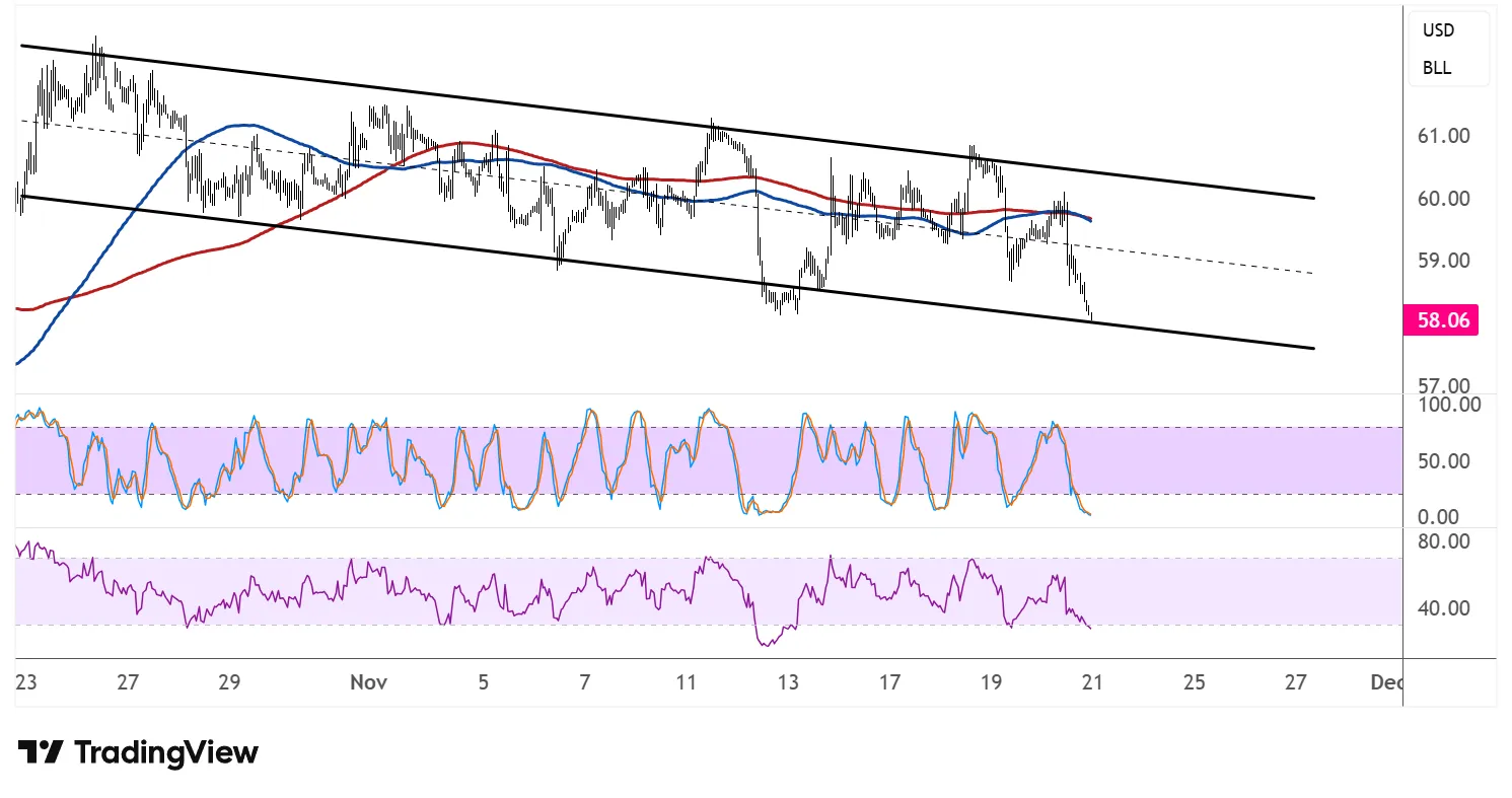 近期的下跌推动价格接近下降通道的下限,可能出现盘整或修正反弹。如果支撑位维持当前水平,原油有望尝试回升至中通道区域,价格约为每桶59.50至60美元,甚至接近通道顶部61.00美元。