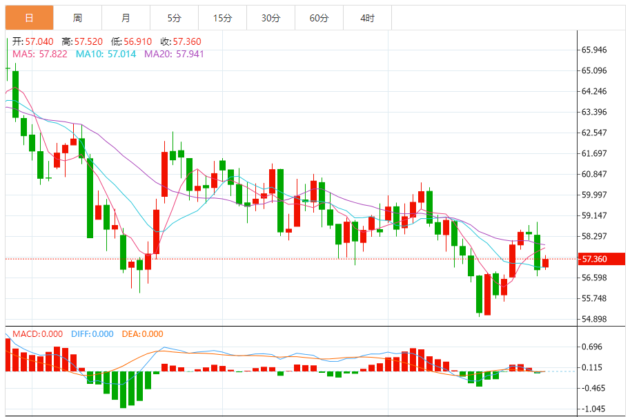 周一(12月29日),美原油价格交投于57.350美元/桶附近,涨幅为1.08%。
