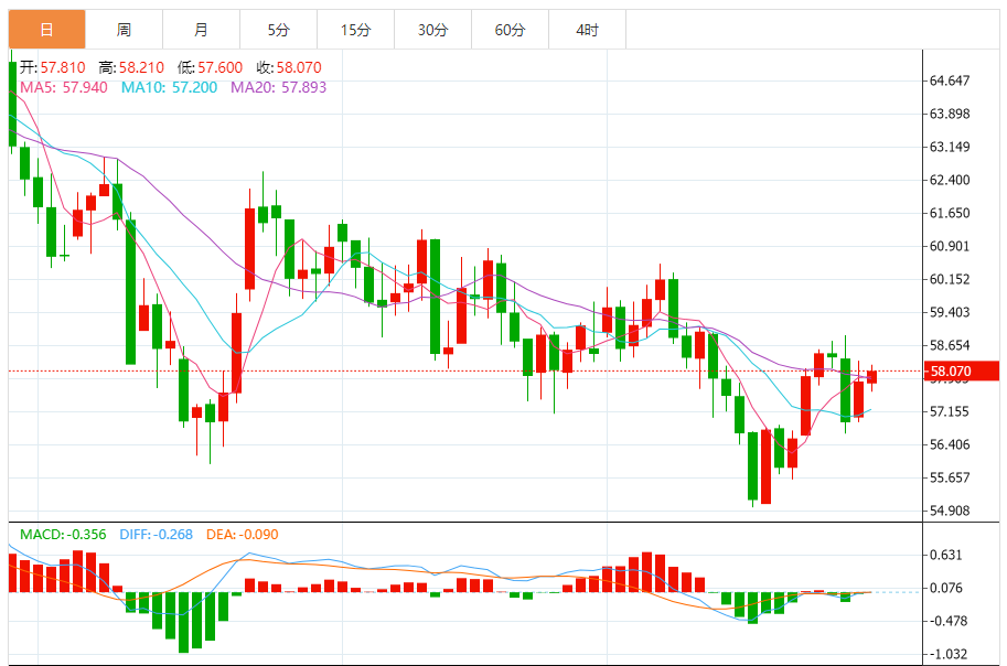 价格仍受制于20日与50日均线压制,短期均线走平,表明市场处于震荡修复阶段。 下方重要支撑位位于56.80美元—56.00美元区间,若有效跌破,可能重新测试年内低点区域。