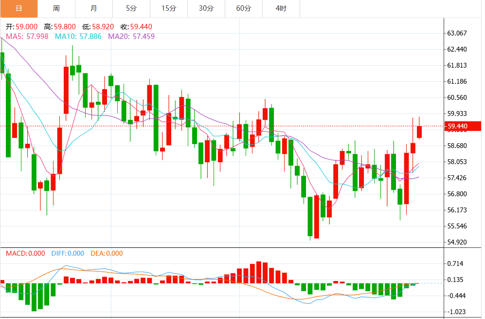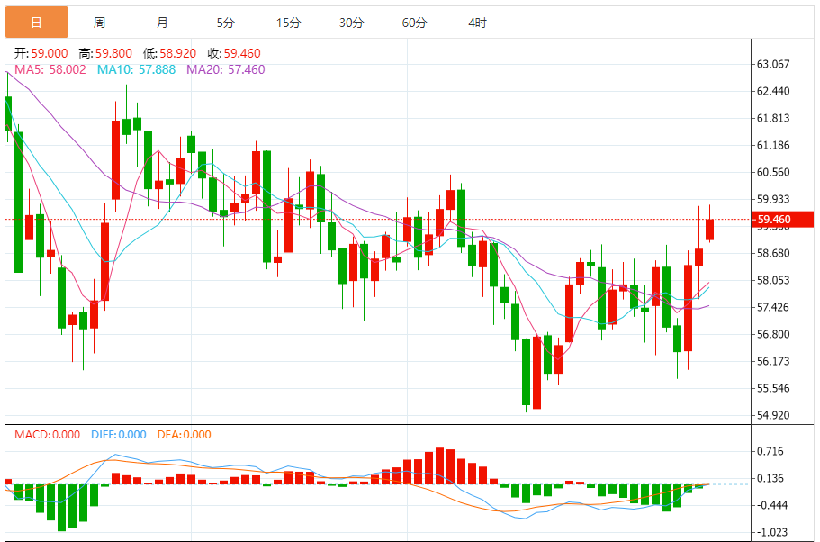 原油从日线图级别看,油价触及54.80附近即入震荡,K线收较大实体阴线,均线系统压制油价,空头排列,中期客观趋势方向向下。当下原油主客观趋势方向一直向下,依据主次交替规律,原油中期走势维持下行节奏不变。原油短线(1H)走势二次下行创新低,下行幅度较前一个交易日放缓。均线系统空头排列,短线客观趋势方向向下不变。MACD指标在零轴下方交织,空头动能占优势。