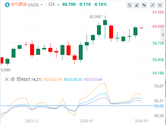 1月22日,原油在周四欧洲早盘交易时段交易时段约为60.70美元。在格陵兰地缘政治紧张局势缓和和供应过剩担忧下,WTI价格保持稳定。