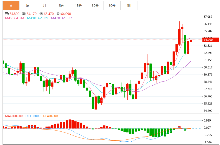移动平均线:WTI原油5日、10日、20日均线呈多头排列,5日均线62.8美元构成短期强支撑