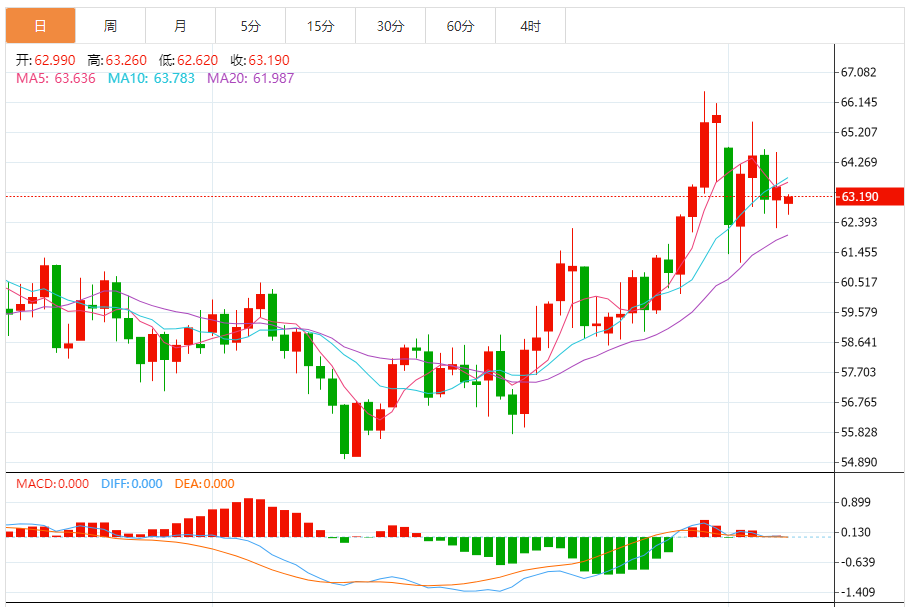 周一(2月9日),美原油价格交投于63.130美元/桶附近,跌幅为0.63%。