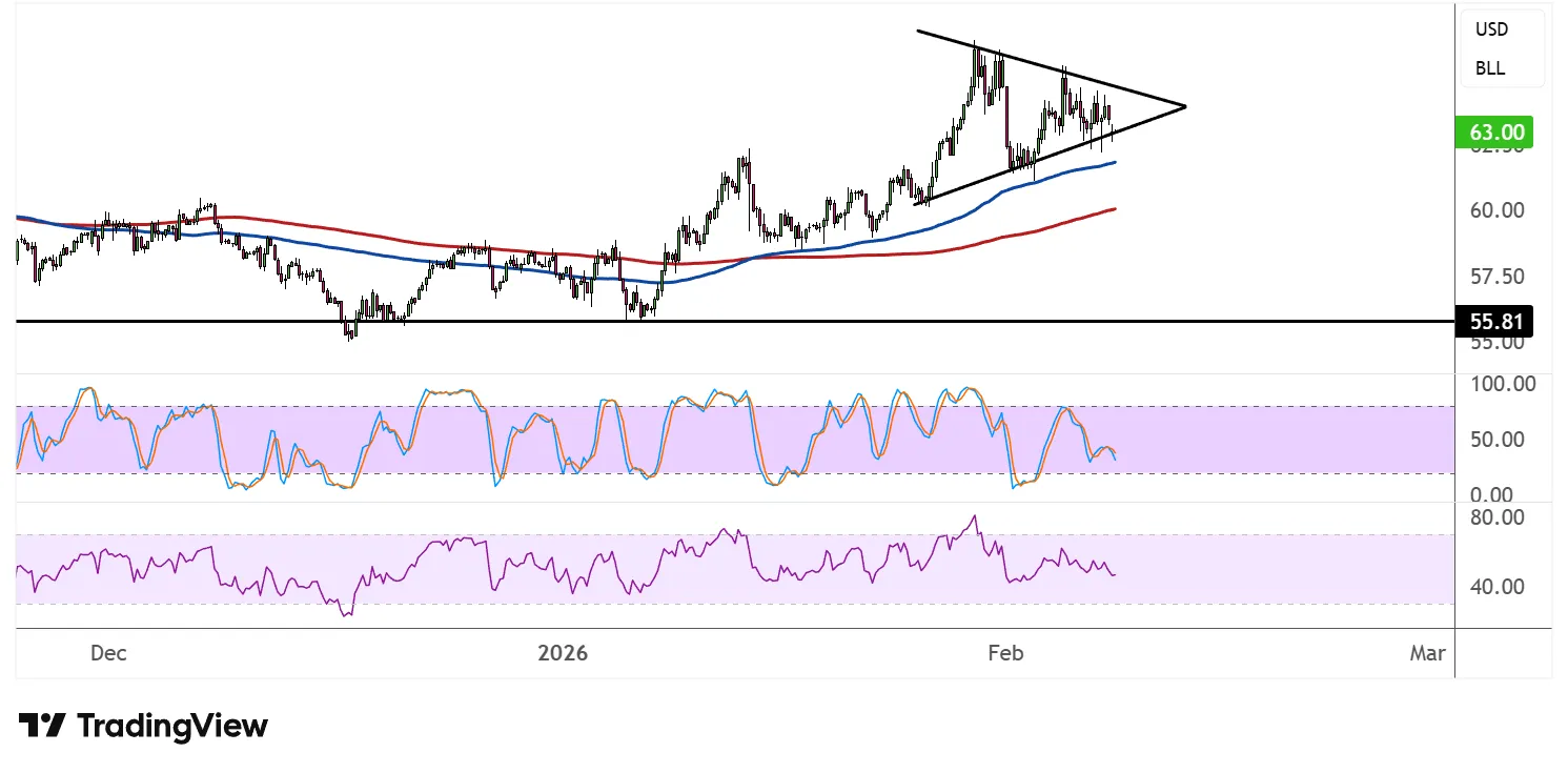 WTI原油日线形成对称三角形形态,表明随着商品决定下一步走向,盘整正在进行。价格目前徘徊在每桶63.00美元左右,正好在三角支撑位,暗示可能出现跌破。