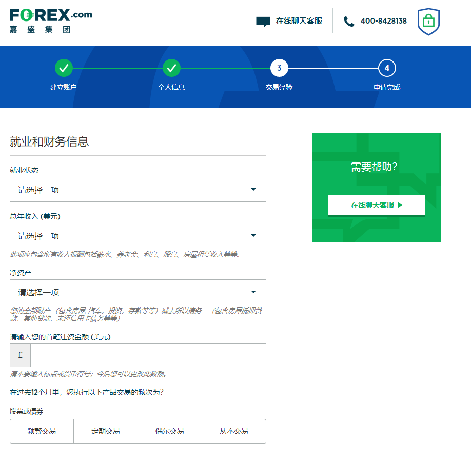 嘉盛集团外汇开户步骤5:继续填写交易经验,包括:就业状态、净资产、年收入等。