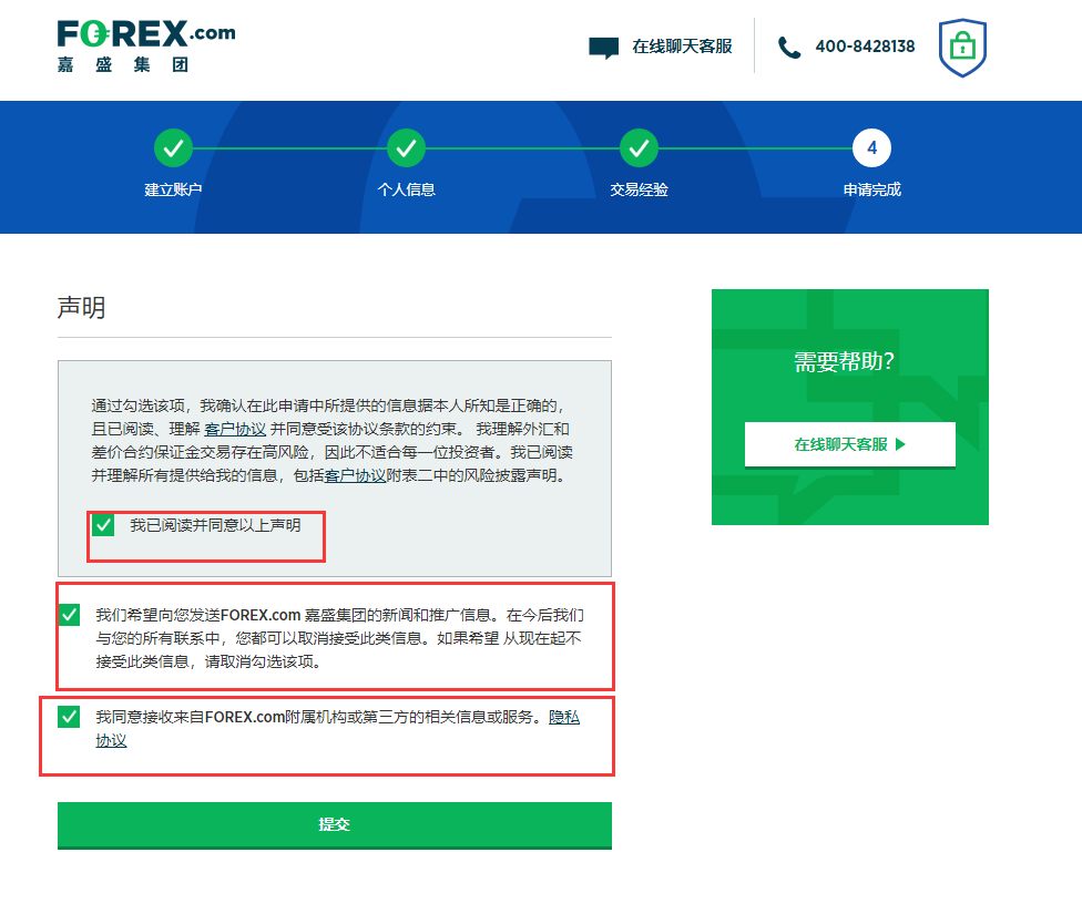 嘉盛集团外汇开户步骤6:同意接收来自FOREX.com附属机构或第三方的相关信息或服务。