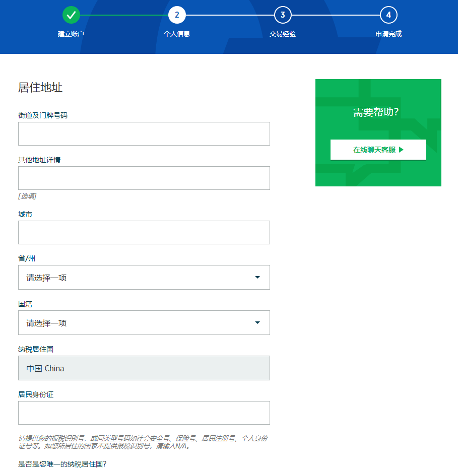 嘉盛集团外汇开户步骤4:继续填写详细信息,包括:街道及门牌号码、城市、国际、身份证等。