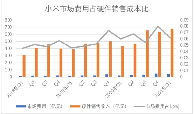 但在2021年Q1,市场费用占硬件销售比回到上年同期的水平,换言之,在硬件销售成长中并未加重市场费用的负担。
