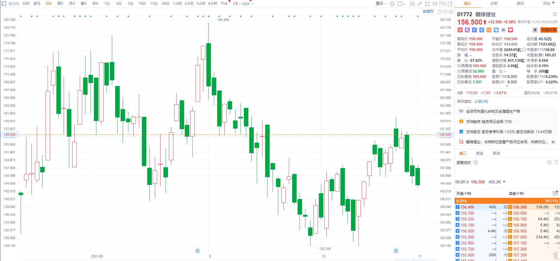 赣锋锂业(1772.HK)高开近9%,报156.5港元,总市值2250亿港元。
